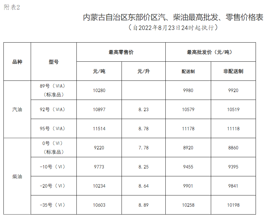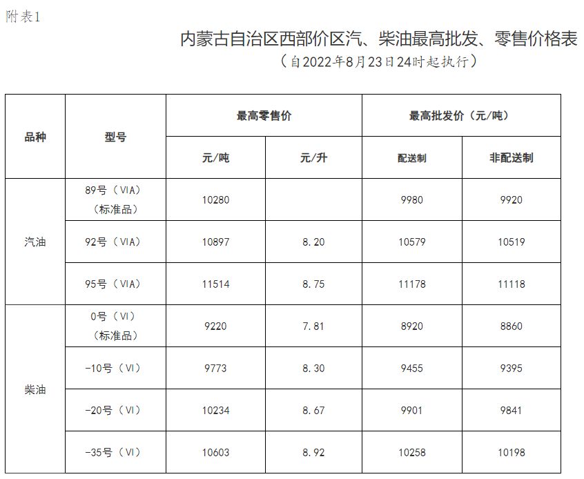 一、自2022年8月23日24时起,我区汽、柴油价格(标准品)每吨分别下调205元和200元,非标准品汽、柴油最高零售价格按照国家规定的品质比率也相应调整(具体价格详见附表)。成品油零售企业可在不超过汽、柴油最高零售价格的前提下,自主制定具体零售价格。