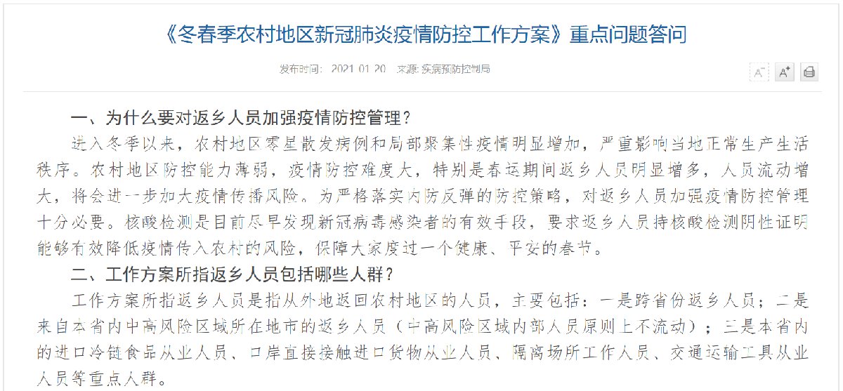 2021年1月20日,国家卫健委发布《冬春季农村地区新冠肺炎疫情防控工作方案》,该《方案》中提及:返乡人员需持7日以内核酸检测阴性证明。