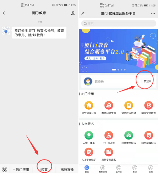 点击下方卡片或搜索【厦门i教育】公众号并关注,点击“厦门i教育”菜单栏,进入首页后点击【去登录】,即可跳转到登录页。
