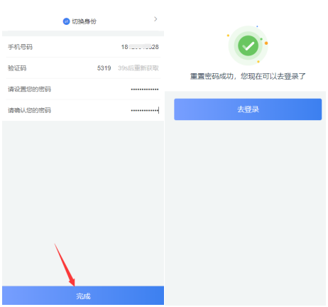 个人找回密码页,输入账号,获取验证码,输入验证码,输入新密码和确认密码,点击【完成】,跳转到设置成功页,点击【重新登录】跳转登录页面,可以使用新密码进行登录。