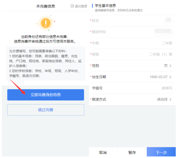 切换学生身份后,可进行学生的信息完善工作,系统将会提示用户进入完善步骤。