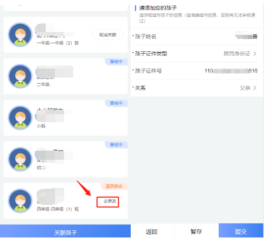 关联孩子申请审核退回的,可修改后重新提交申请。在退回修改状态下方点击【去修改】,跳转到关联孩子表单,修改信息后提交即可。