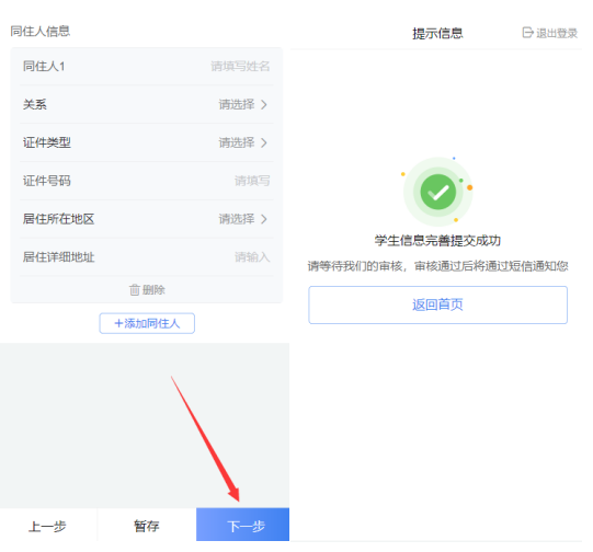 学生完善身份信息,填写同住人基本信息,完成后点击【下一步】即可提交学生完善身份信息给年段长/班主任审核。