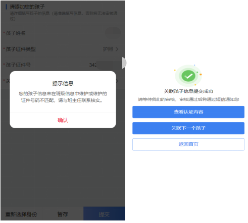 点击【关联孩子】,跳转到添加您的孩子页面,输入孩子的姓名、证件类型、证件号和关系,点击【提交】,如果输入的孩子没有在系统,就会提示信息有误,需自行注册;如果系统有匹配的学生信息,即可提交成功!