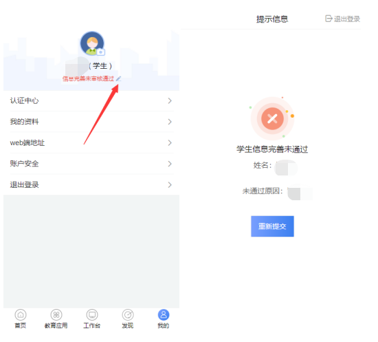 若学生完善信息被审核驳回后,可在我的页面查看,状态显示【信息完善未审核通过】,点击编辑图标,会跳转到审核未通过的提示页面,可查看未通过原因,可重新申请编辑信息后重新提交。