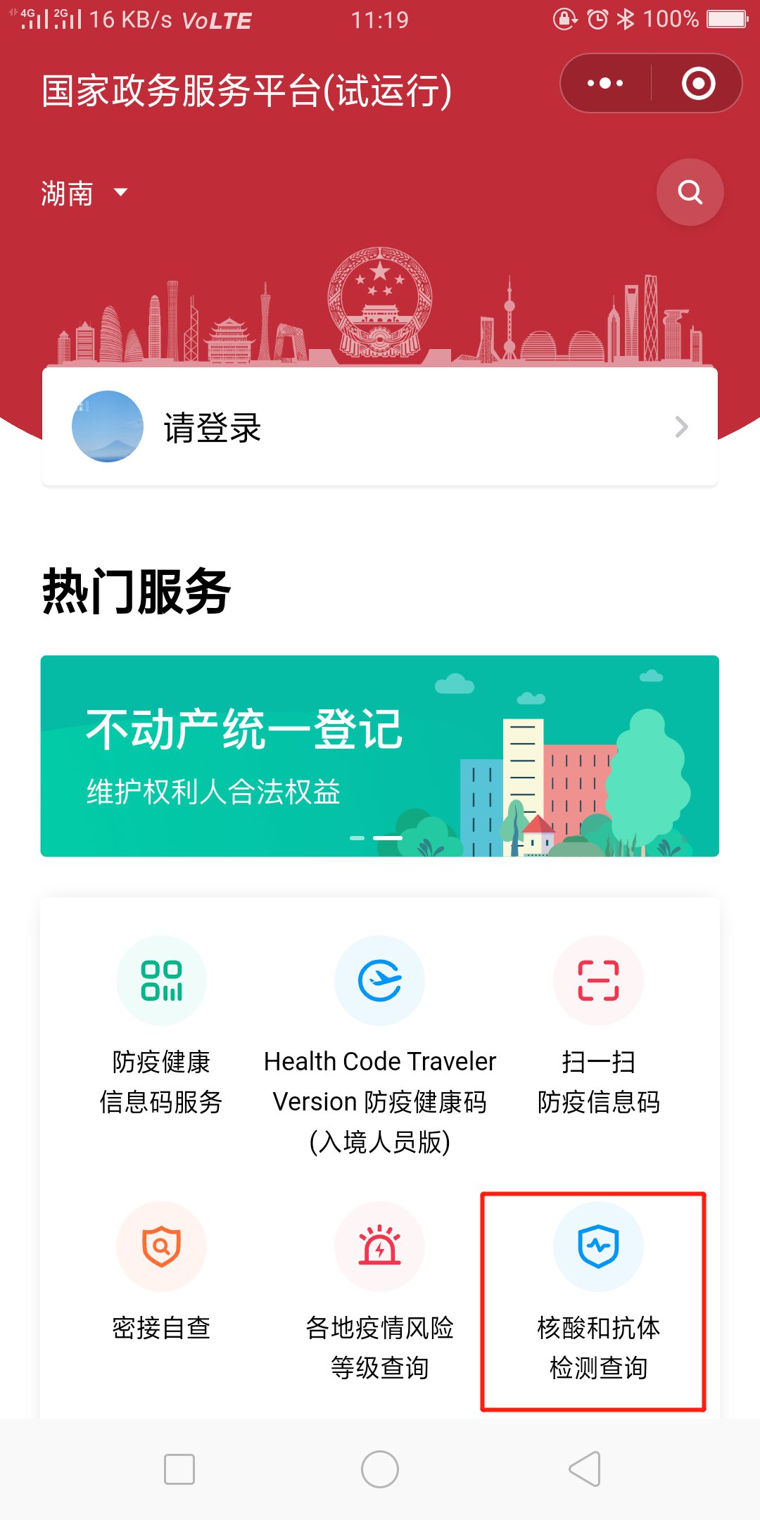 第二步,在热门服务中找到并点击“核酸和抗体检测结果查询”;