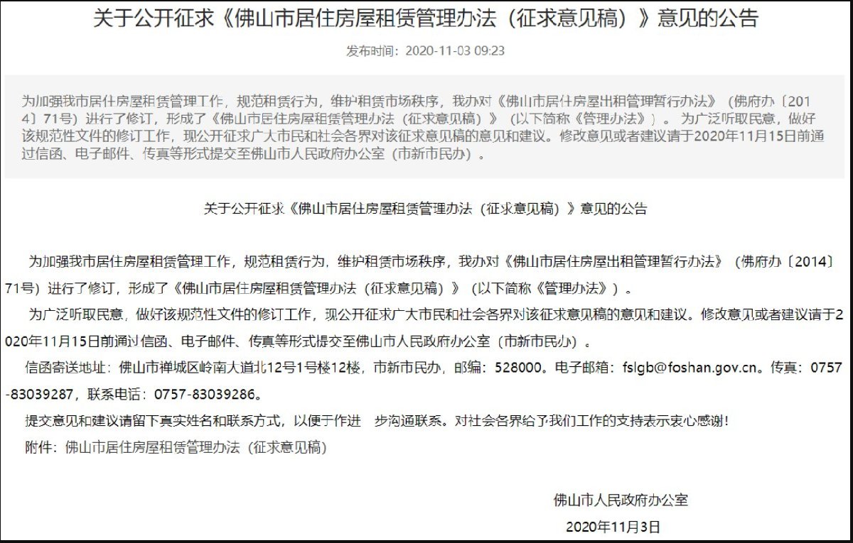 2020年11月3日,据佛山市人民政府网最新消息:《佛山市居住房屋租赁管理办法(征求意见稿)》公开征求意见中,市民的修改意见或者建议请于2020年11月15日前通过信函、电子邮件、传真等形式提交至佛山市人民政府办公室(市新市民办)。