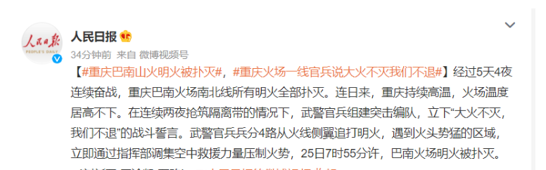 经过5天4夜连续奋战,重庆巴南火场南北线所有明火全部扑灭。连日来,重庆持续高温,火场温度居高不下。在连续两夜抢筑隔离带的情况下,武警官兵组建突击编队,立下“大火不灭,我们不退”的战斗誓言。武警官兵兵分4路从火线侧翼追打明火,遇到火头势猛的区域,立即通过指挥部调集空中救援力量压制火势,25日7时55分许,巴南火场明火被扑灭。