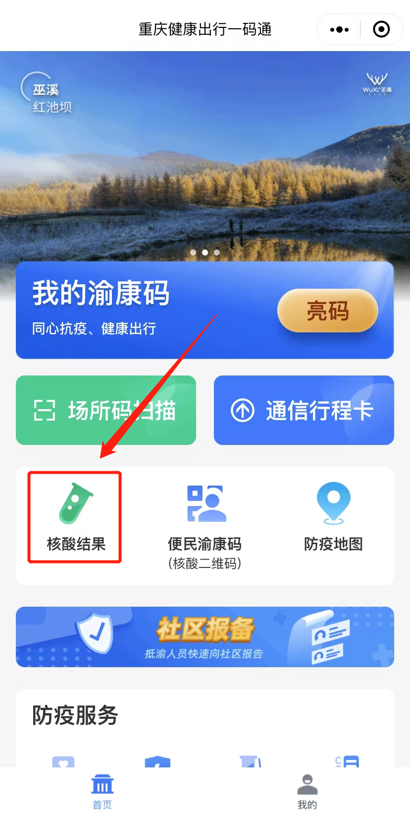 大家可以在“重庆健康出行一码通”小程序首页【核酸结果】查询自己的核酸检测结果。