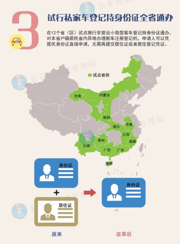 在12个省(区)试点推行非营运小微型客车登记持身份证通办,对本省户籍居民省内异地办理新车注册登记的,申请人可以凭居民身份证直接申请,无需再提交居住证或者居住登记凭证,便利群众省内异地购车登记,助推省域经济一体化发展。