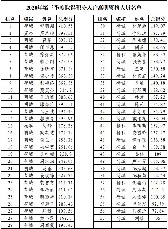 2020年高明区第三季度积分落户名单公示