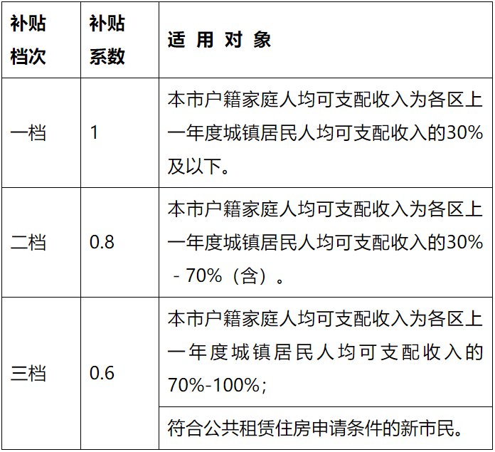例如,本市户籍家庭,人均可支配收入为各区上一年度城镇居民人均可支配收入的30%及以下的,按第一档计算,补贴系数为1。对于可支配收入情况更好的家庭,补贴系数递减。