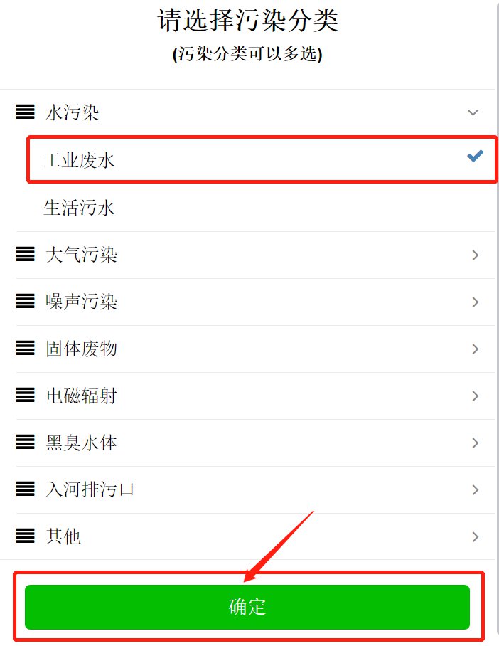 ②点击“已阅读说明”,选择污染分类(可多选),以下以工业废水为例,点击“确定”。