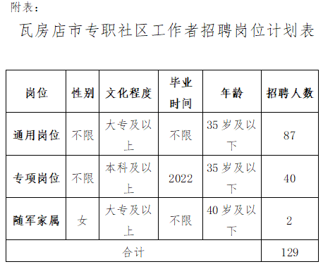 本次共招聘专职社区工作者129人,其中通用岗位87人,专项岗位40人,随军家属岗位2人,具体岗位见附表。