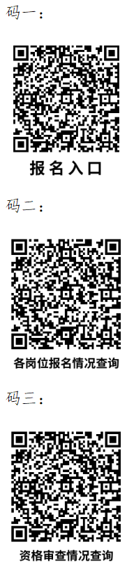报名期间,报考人员可以通过扫描二维码(码二)的方式,查询各岗位报名人数情况。报名后,报考人员可以扫描二维码(码三)查询资格审查进度情况。