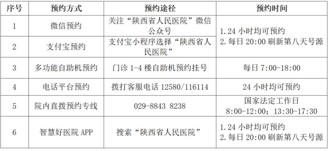 普通门诊实行实名制分时段“非急诊全预约就诊模式”,预约挂号前请如实填写《陕西省人民医院预检筛查表》,门诊就诊非必要不陪同,在预约时段前30分钟来院就诊,不要过早来医院聚集等候。急诊、发热门诊、核酸检测24小时开放。