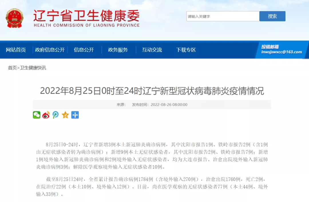 8月25日0—24时,辽宁省新增3例本土新冠肺炎确诊病例,其中沈阳市报告1例、铁岭市报告2例(含1例由无症状感染者转为确诊病例);新增9例本土无症状感染者,其中沈阳市报告2例、铁岭市报告7例;新增1例境外输入新冠肺炎确诊病例和2例境外输入无症状感染者,均为大连市报告。治愈出院境外输入新冠肺炎确诊病例3例;解除医学观察境外输入无症状感染者10例。