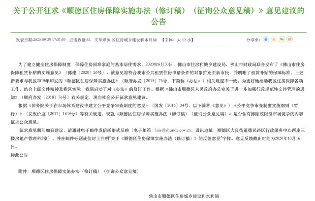 顺德此次启动的修订,结合了上级文件精神及全区实际,旨在更好地推动顺德区住房保障各项工作,市民如有意见建议,可于10月16日前通过电子邮件或信函形式反映。