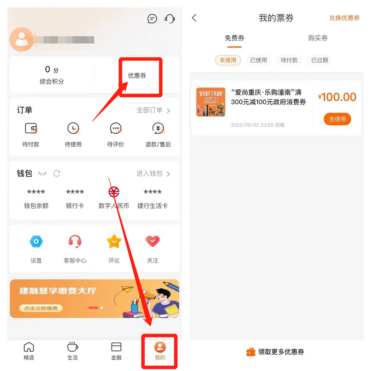 打开建行生活APP,点击右下角【我的】,再点击【优惠券】即可查看你的消费券啦