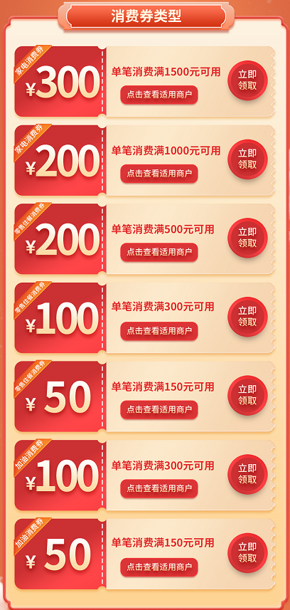 4、消费者获取消费券后,家电消费券、零售住餐消费券和加油消费券按照以下模式使用:家电消费券单笔消费1500元以上(含1500元),可以使用300元消费券一张;单笔消费1000元以上(含1000元),可以使用200元消费券一张。零售住餐消费券单笔消费500元以上(含500元),可以使用200元消费券一张;单笔消费300元以上(含300元),可以使用100元消费券一张:单笔消费150元以上(含150元),可以使用50元消费券一张。加油消费券单笔消费300元以上(含300元),可以使用100元消费券一张:单笔消费200元以上(含200元),可以使用50元消费券一张。消费券不找零,可以同时叠加活动企业商户的其它优惠活动。