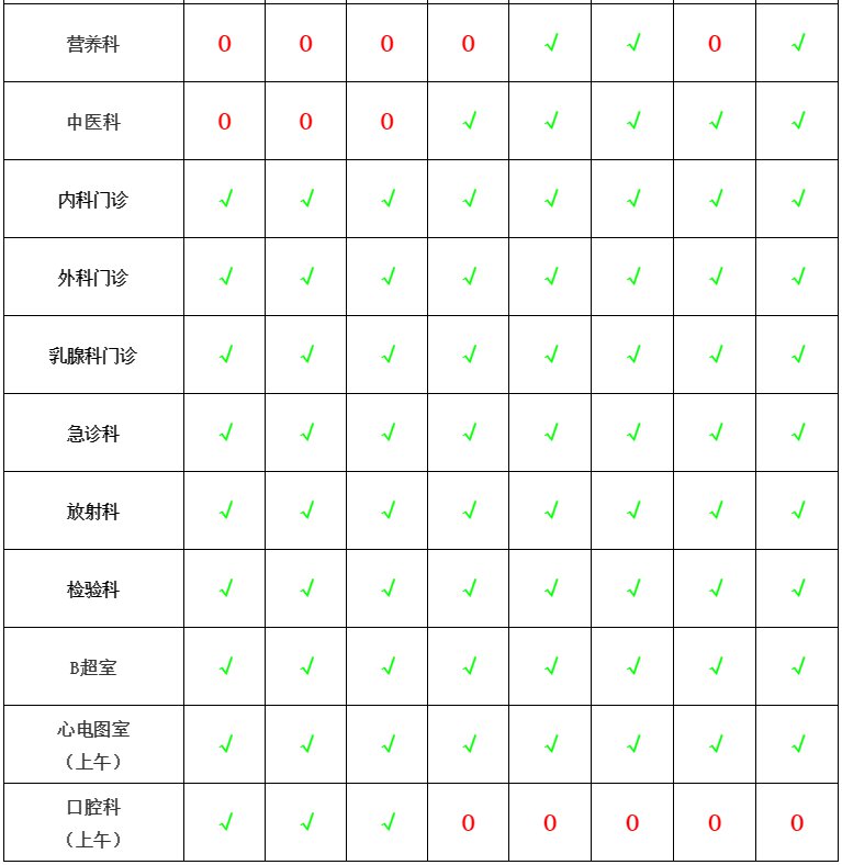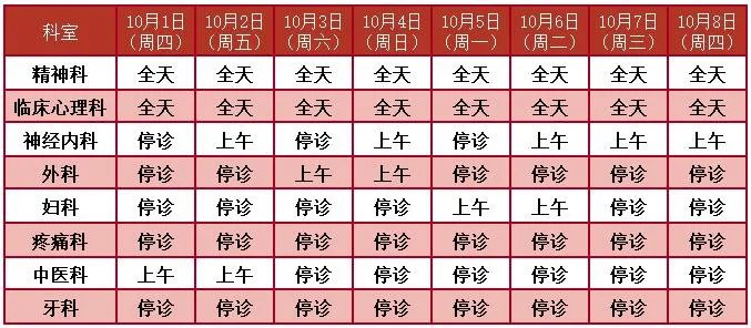 妇科、皮肤科、中医骨伤科、中医理疗科、中医科、体检中心10月1日—10月8日(中秋国庆假期)停诊。
