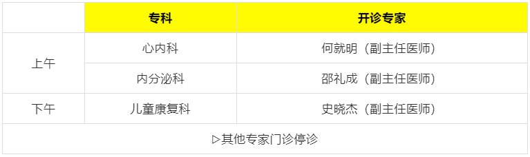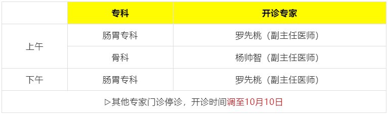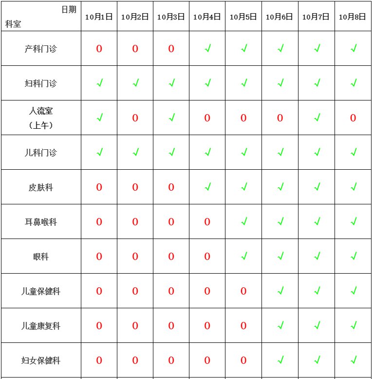 10月1日至8日假期门诊,10月10日(周六)工作日门诊,假期门诊安排如下: