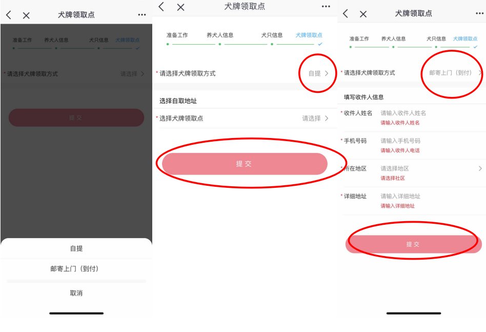 注:犬牌领取方式分为“自提”和“邮寄上门(到付)”两种方式,只能选择其中一种。选择“自提”的,请选择相应的服务点自提;选择“邮寄上门(到付)”的,需申请人自行承担邮寄费用。