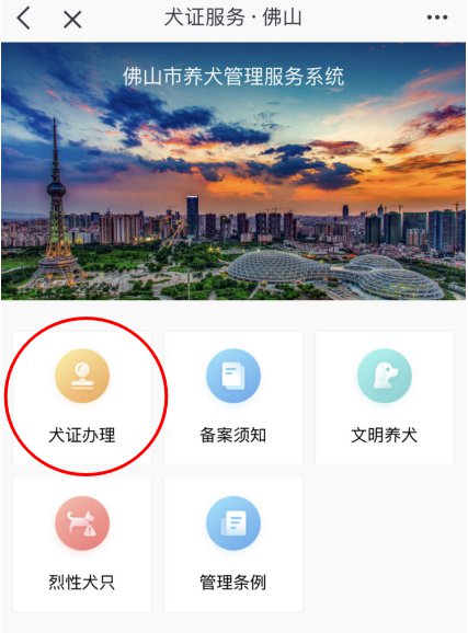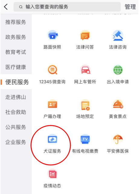 一、下载“佛山通APP”,注册并认证身份信息,进入主页面,点击“全部——便民服务——犬证服务”。