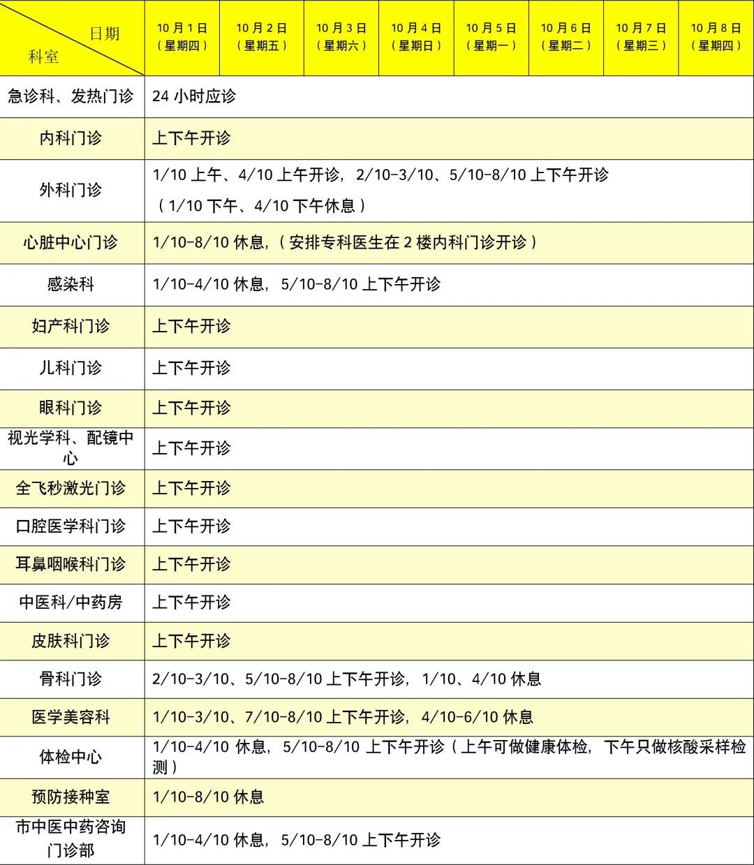 10月1日至8日假期门诊,10月10日(周六)工作日门诊,假期门诊安排如下: