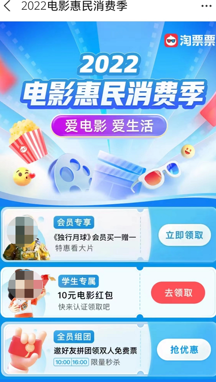 打开淘票票APP,点击页面上方“爱电影·爱生活”2022年电影惠民消费季专区专栏,即可领取观影消费券。