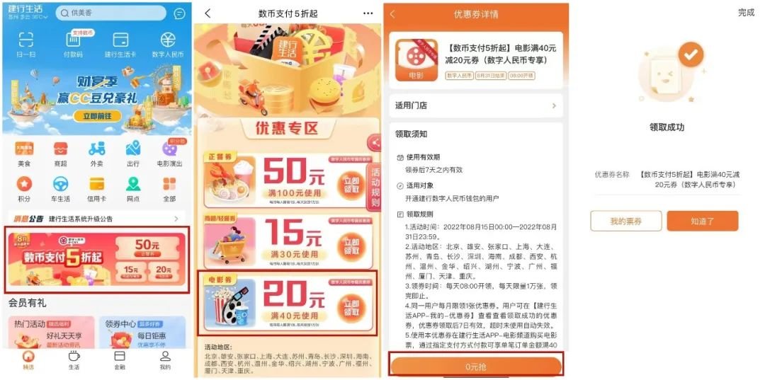 打开“建行生活”APP,点击进入“数币支付5折起”,即可领取电影券啦!