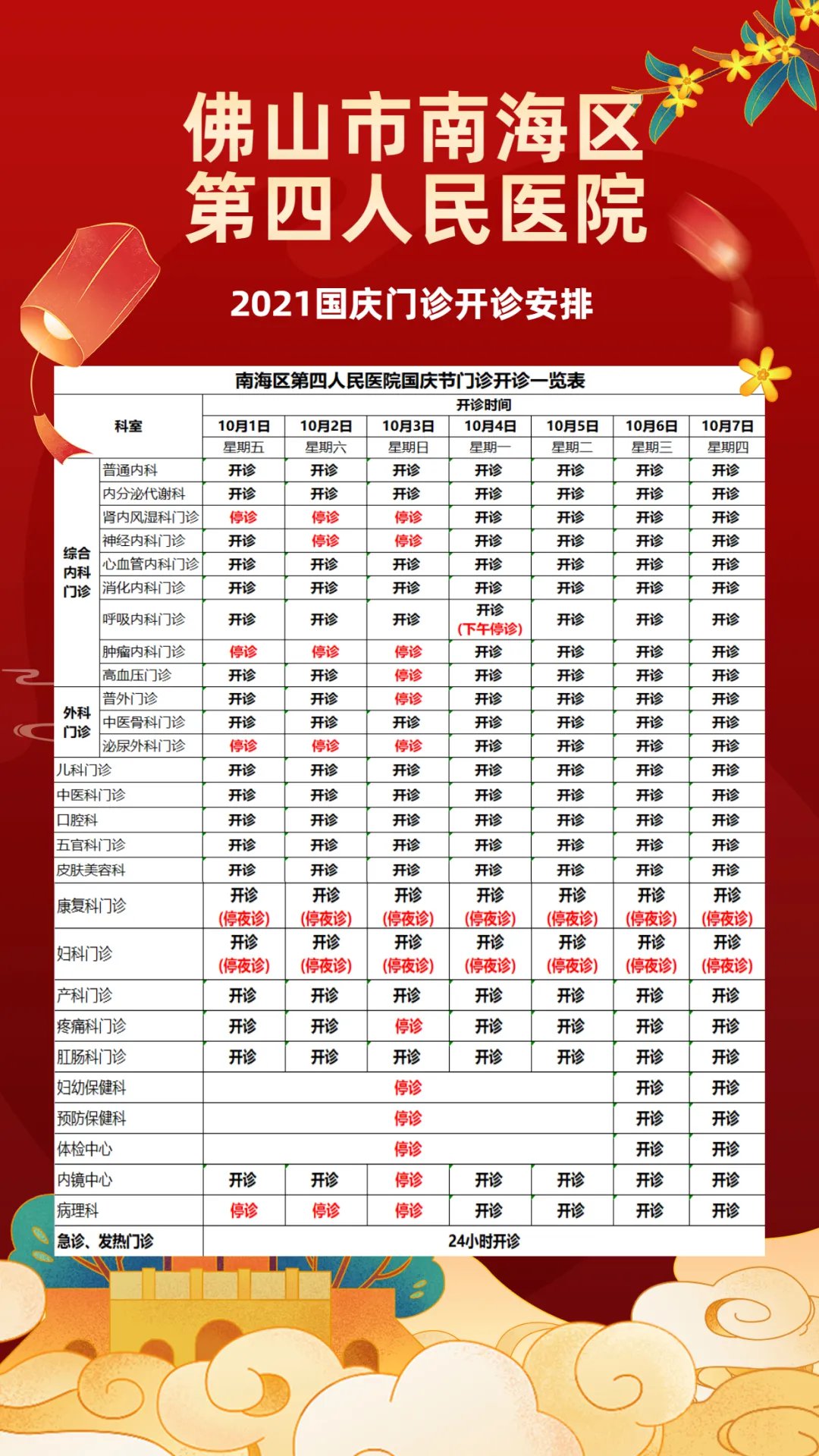 根据国家及医院《2021年节假日放假调休安排》,结合我院实际情况,现将南海四院门诊2021年国庆节出诊安排通知如下: