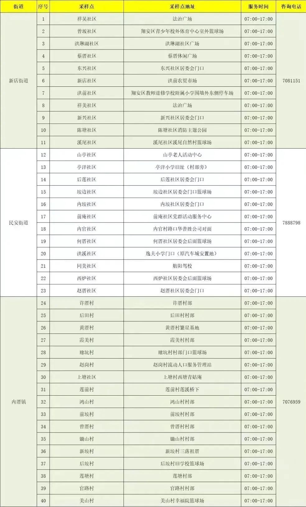 我区于新店街道、民安街道、内厝镇集中开展核酸检测,以上镇街居民,可前往社区核酸采样点进行检测。