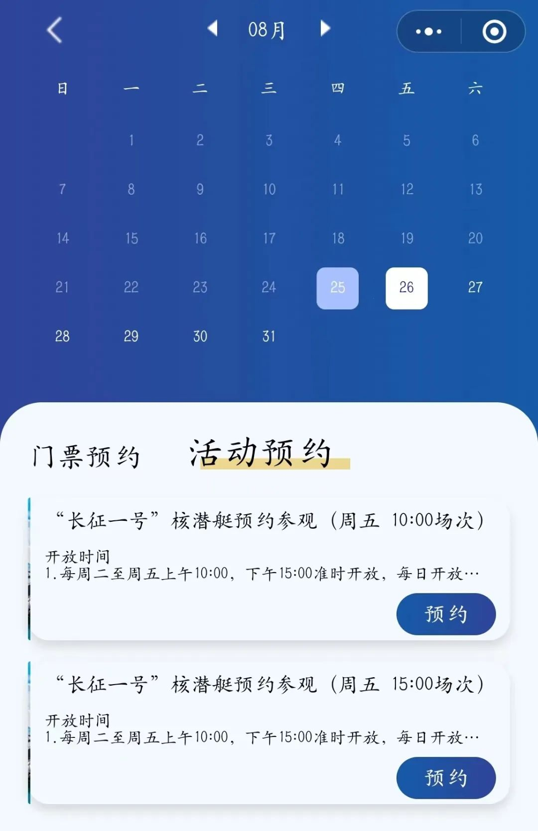 答:青岛海军博物馆核潜艇能预约参观了,每周六12点放票,预约上的朋友就可以在指定时间内去参观。