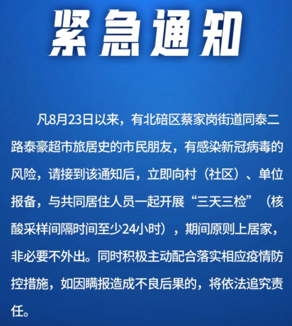 凡8月23日以来,有北碚区蔡家岗街道同泰二路泰豪超市旅居史的市民朋友,有感染新冠病毒的风险,请接到该通知后,立即向村(社区)单位报备,与共同居住人员一起开展“三天三检”