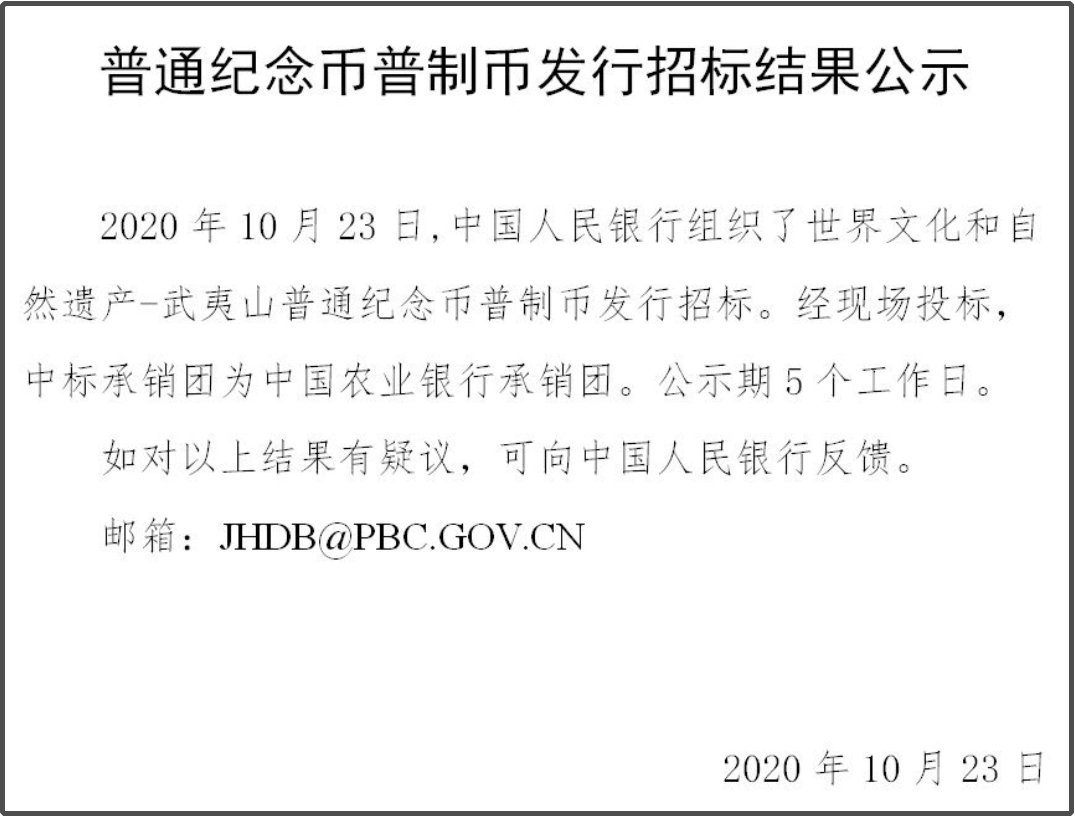 公告称:这次武夷山币的中标承销团是中国农业银行承销团。也就是说,这次的武夷山币,全国人民都是在中国农业银行预约!