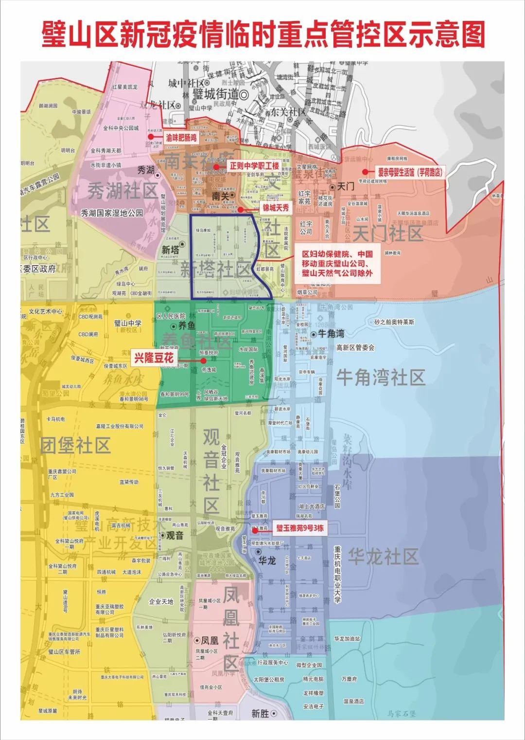 璧玉雅苑9号3栋,红宇大道以南、沿河西路以西、双星大道以北、东林大道以东合围的区域(区妇幼保健院、中国移动通信集团重庆有限公司璧山分公司、重庆璧山天然气有限责任公司除外),锦城天秀,爱亲母婴生活馆(芋荷路店),渝味肥肠鸡,兴隆豆花,正则中学职工楼(见附图)。