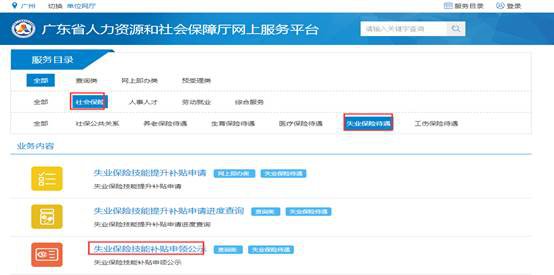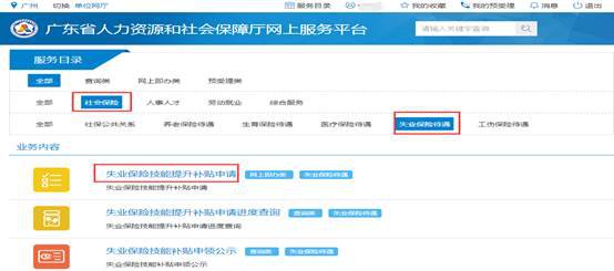 1、广东省人力资源和社会保障厅网上服务平台→社会保险→失业保险待遇→失业保险技能提升补贴申请,如下图: