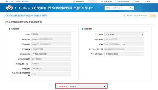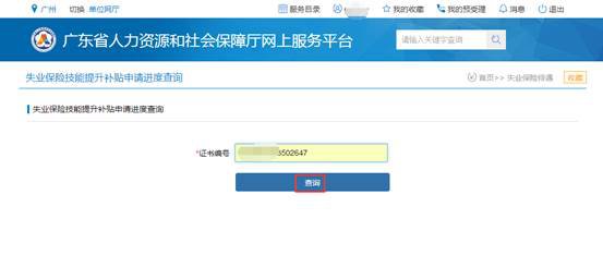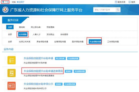 1、广东省人力资源和社会保障厅网上服务平台→社会保险→失业保险待遇→失业保险技能提升补贴申请进度查询,如下图: