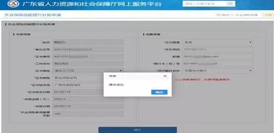 ③校验证书等级是否符合要求(3,4,5级),若其中一项不符合申领条件则系统提示错误信息,若满足申领条件则可继续办理失业保险技能提升补贴申请,显示效果如下图所示: