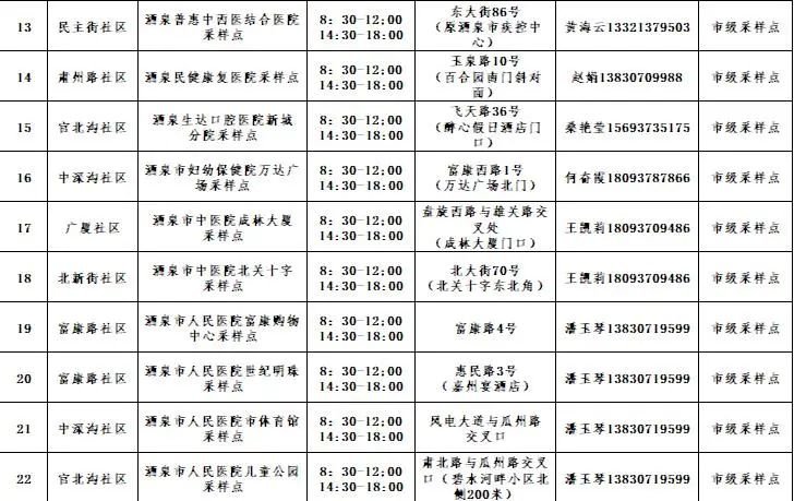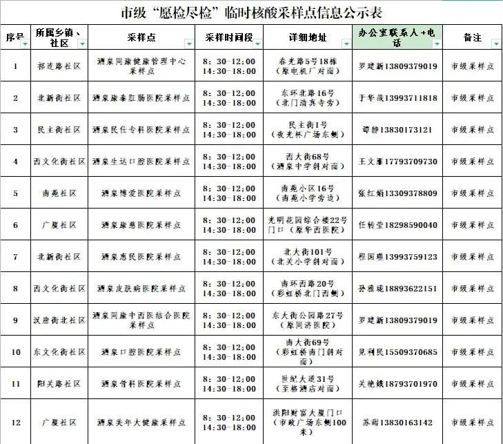 为进一步织牢织密疫情防护网,方便辖区居民随时随地进行常态化核酸检测,现将增设的22处市级愿检尽检(收费)核酸采样点进行公示,请广大居民根据个人需求,从公布的核酸采样点中选择就近机构进行采样。现将采样点地址、联系电话、采样时间公示如下: