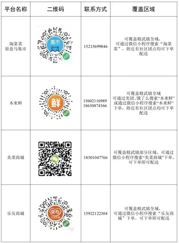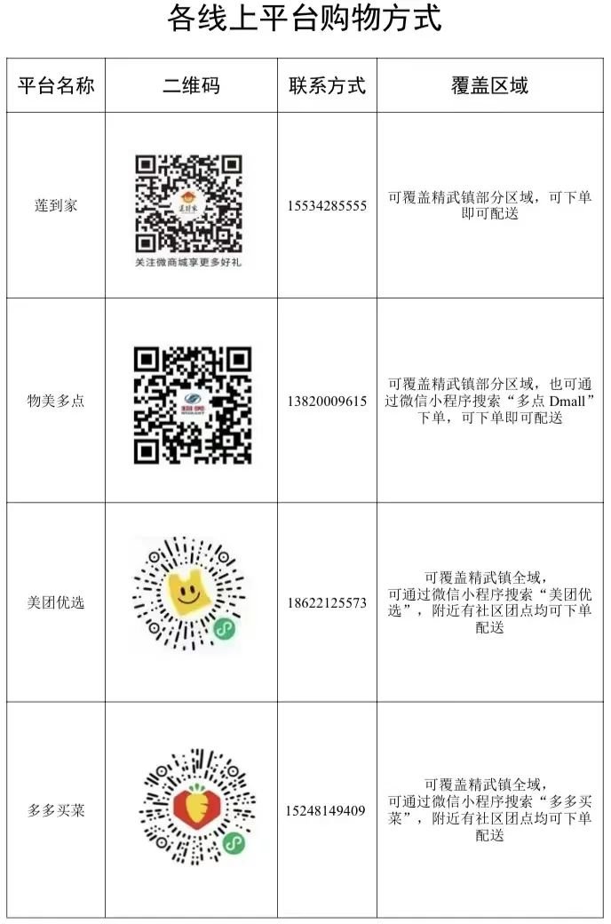 为做好生活物资保障工作,满足广大居民多样化生活必需品购买需求,我区协调华喜汇通莲到家、物美多点、美团优选、多多买菜、淘菜菜、本来鲜、美菜商城、乐友商城等8家平台(排名不分先后)提供线上购物服务,消费者可扫描二维码或搜索微信小程序进行线上购物,由平台配送到小区外。根据疫情管控形势,居民下楼自取或按疫情防控要求由志愿者组织分发。