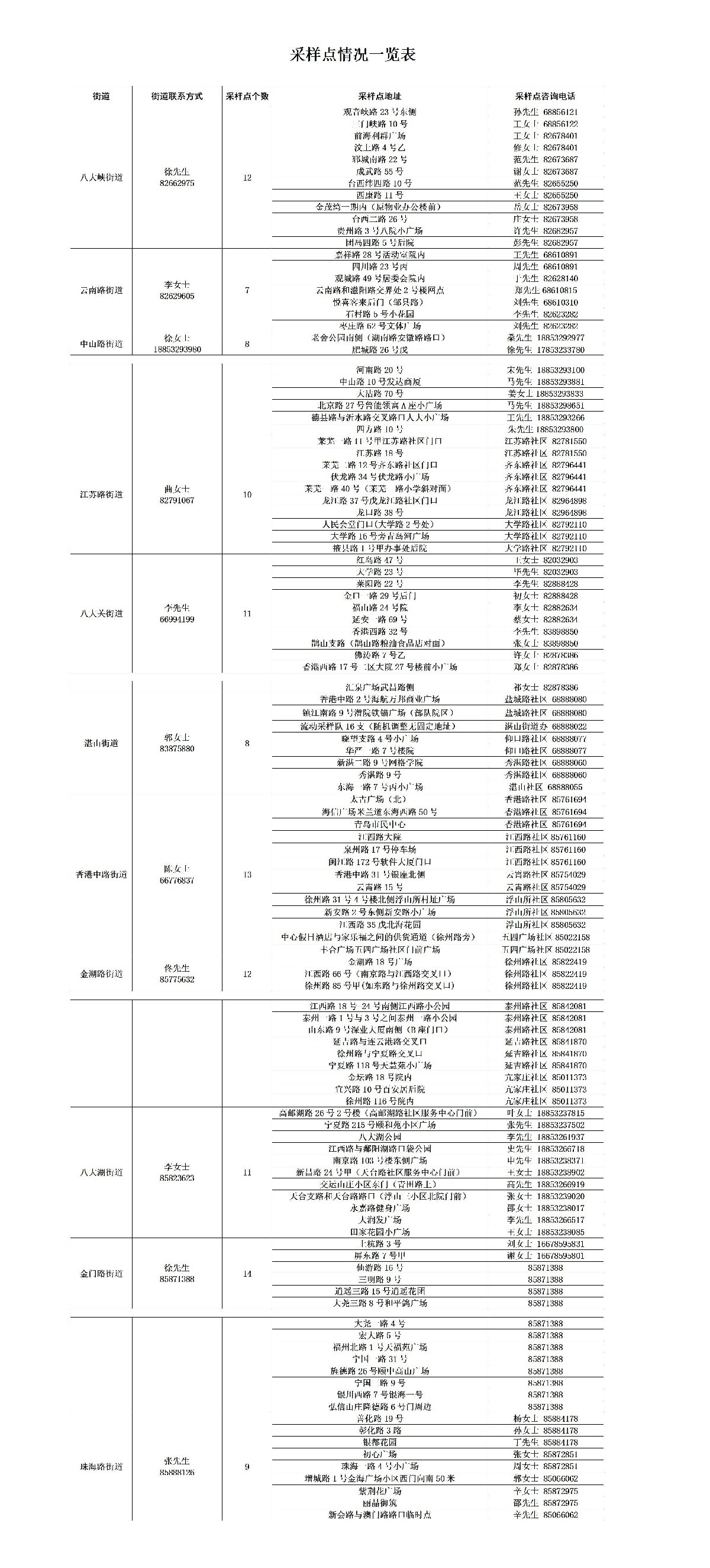由各街道办事处统一安排采样点,具体信息详见采样点情况一览表(附后),或扫描“市南区核酸检测采样点地图小程序”(附后),对核酸检测采样点进行查询。