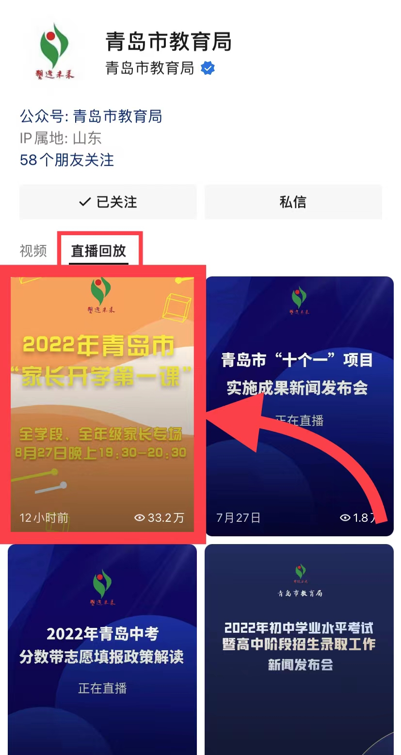 直播回放观看入口:进入青岛市教育局视频号,点击“直播回放”即可查看