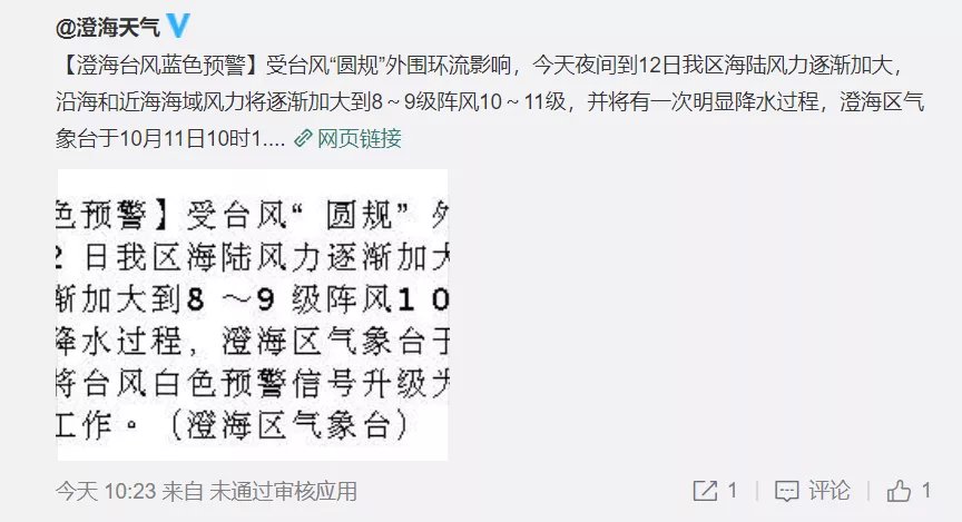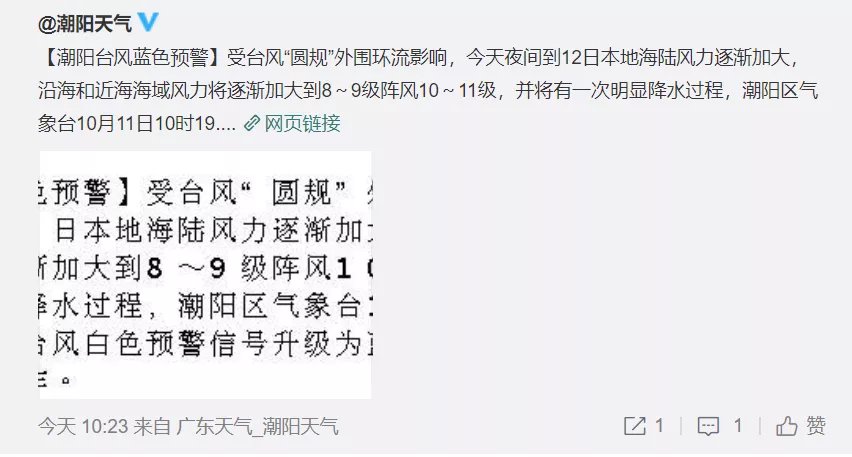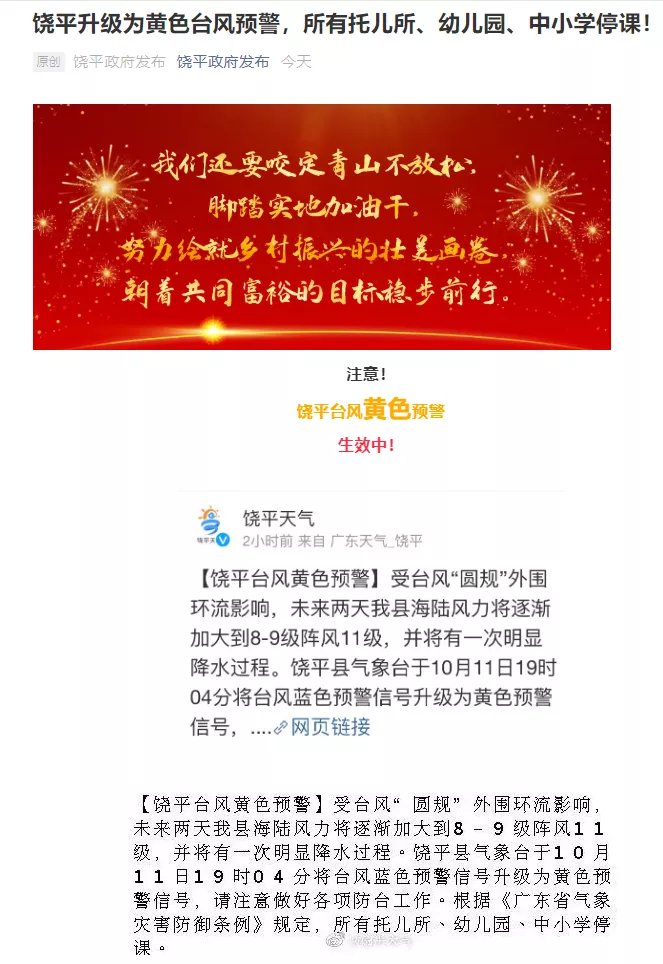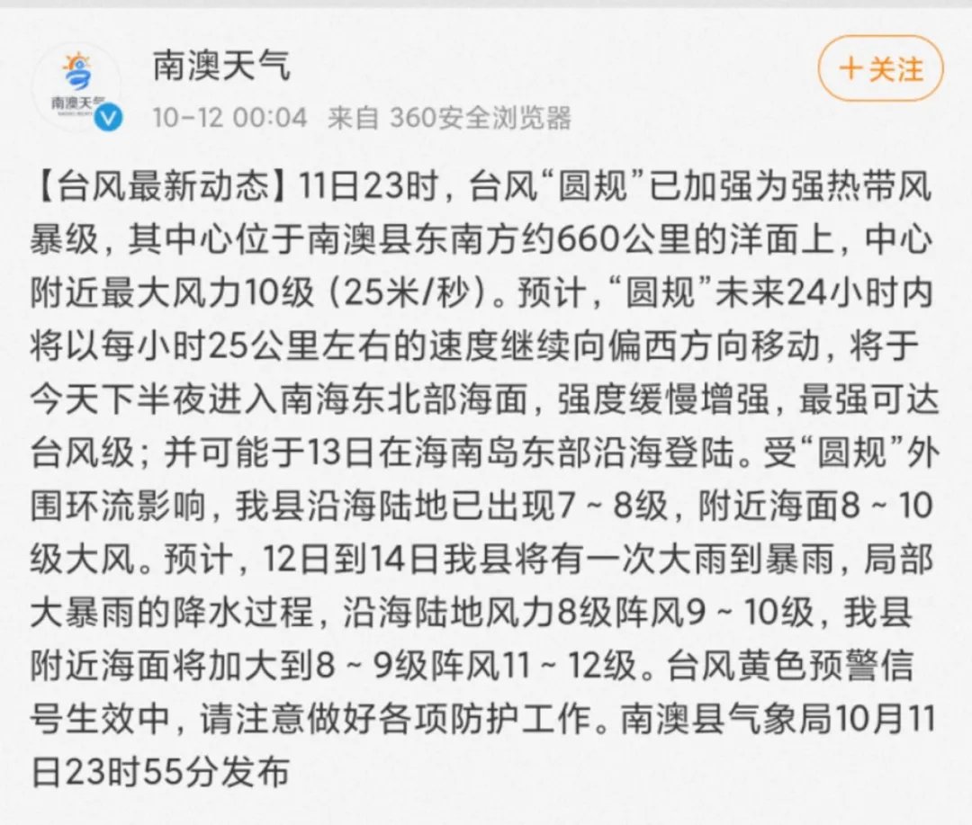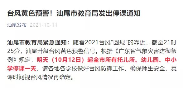 最新消息:据@广东天气 消息,随着台风“圆规”的靠近,汕尾、饶平、汕头、南澳、潮阳和澄海升级台风黄色预警信号,10月12日停课。