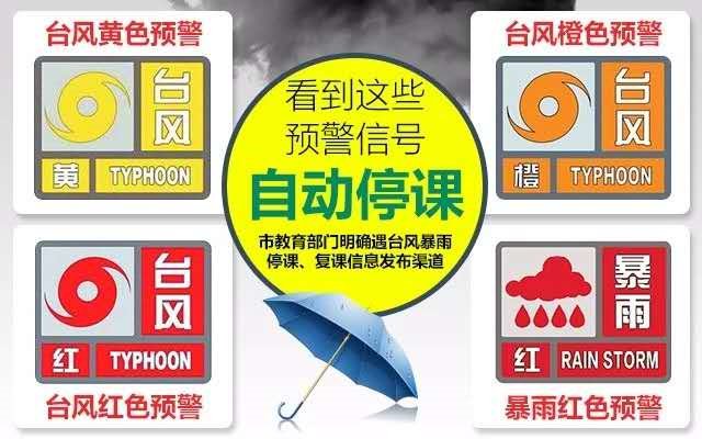 停课标准:气象部门发布的台风黄色、橙色、红色预警信号和暴雨红色预警信号为停课信号。其发布遵循"属地管理"原则,各地级以上市、县(区、市)气象部门发布了以上台风暴雨预警信号,对应区域内所有托儿所、幼儿园、中小学校、中等职业学校停课。