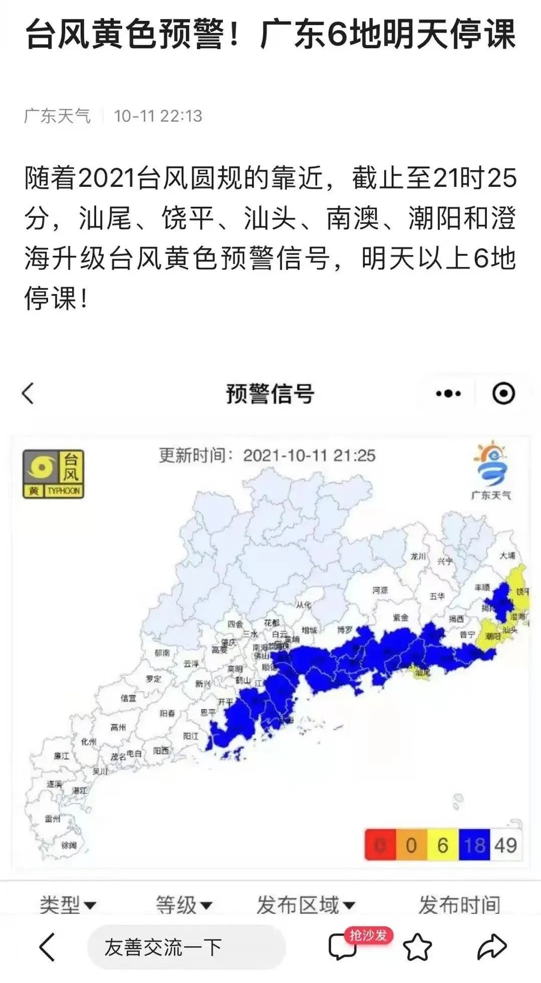 佛山市教育局回应,台风暴雨预警信号发布遵循“属地管理”原则。2021年10月12日11时45分佛山气象台将台风白色预警升级为蓝色预警。