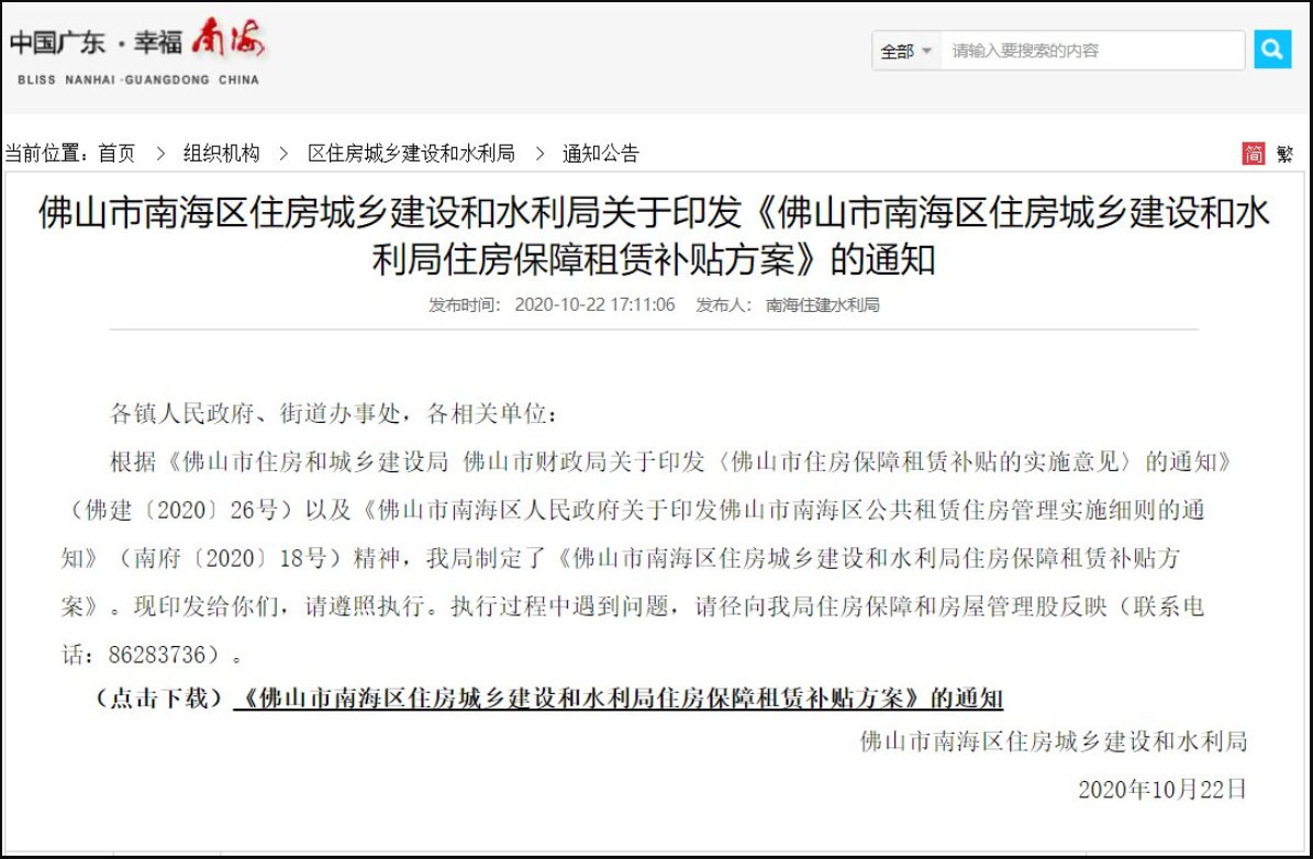 2020年10月22日,南海区住房保障租赁补贴方案正式出台!