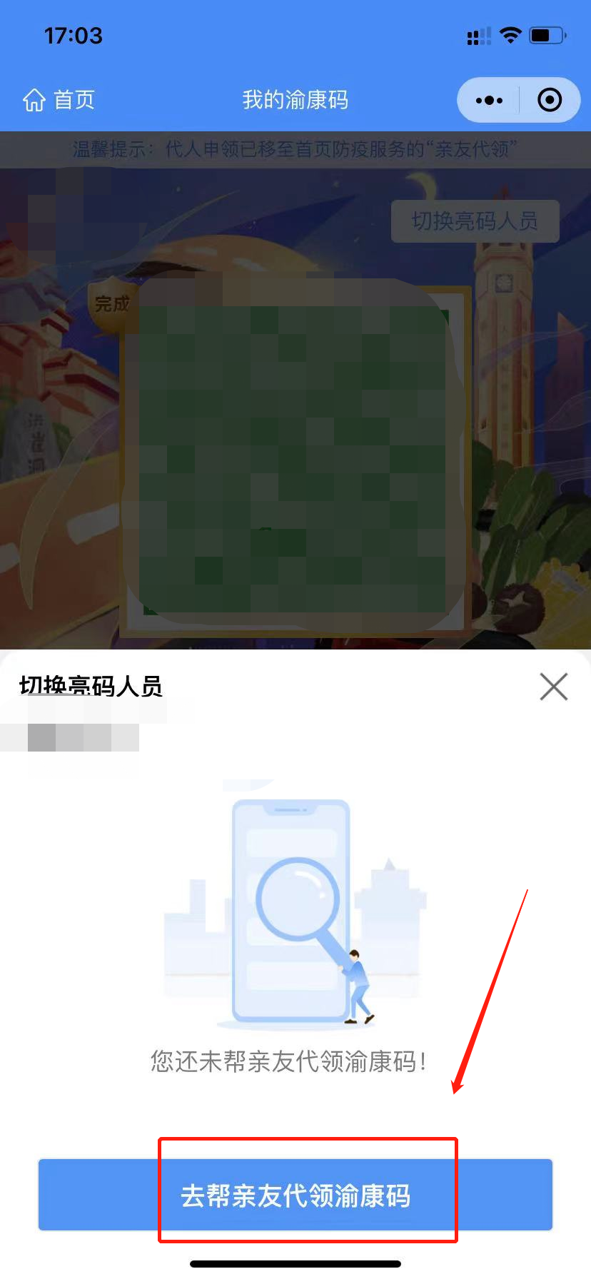 打卡渝康码小程序,点击右上角-切换亮码人员