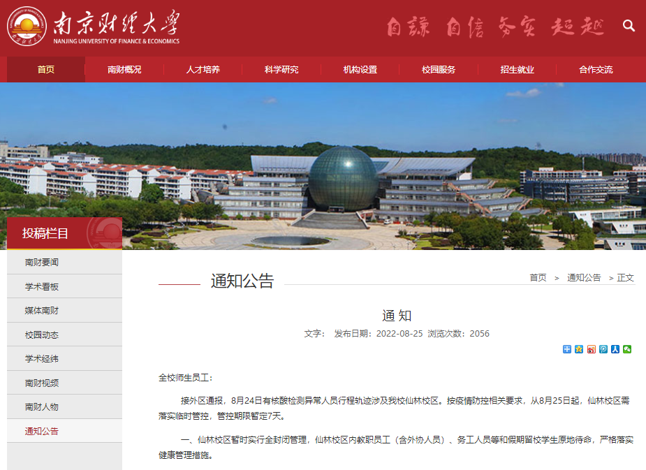 2022秋学期南京财经大学原计划于8月26日-28日到校报到的全体师生延期到校